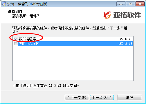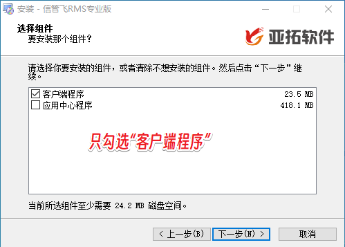 点“下一步”按钮进入选择安装组件界面,如果购买的是网络版,在客户端电脑上(非主机电脑),只需要打勾选择安装“客户端程序”,不需要安装“应用中心程序”。