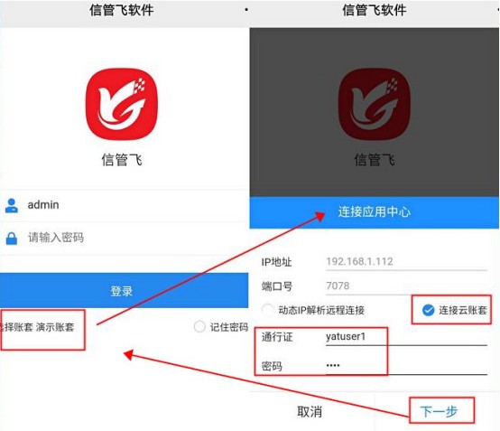 在弹出的登录界面。点击选择账套,勾选动态ip解析远程连接或连接云账套,输入购买后分配的解析账号和密码或通行证和密码。点击下一步,进入选择账套界面。选择下账套,点击选择账套,进入登录窗口,默认登录操作员是:admin(系统管理员),密码为自己设置的密码(如没有密码,直接点击登录)。如需其他操作员登录,可电脑端员工信息中查看员工对应的员工编码,输入此信息登录。如下图所示: