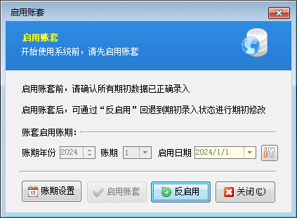 启用账期:是指准备从哪个月份开始使用软件(举例:假设当前月份为2025年4月份,但我们想从2025年2月份开始使用软件,可以将启用账期设置为2025年、账期为2,这样我们需要整理的期初数据就应该是截止到2025-02-01前的期初应收应付款、期初商品库存,开账后就可以录入2025-02-01之后的业务单据)。