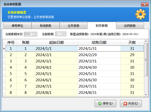 账期设置:点“账期设置”按钮可以设置每个账期的起始日期。每年共12个账期,默认是按照自然月划分账期。