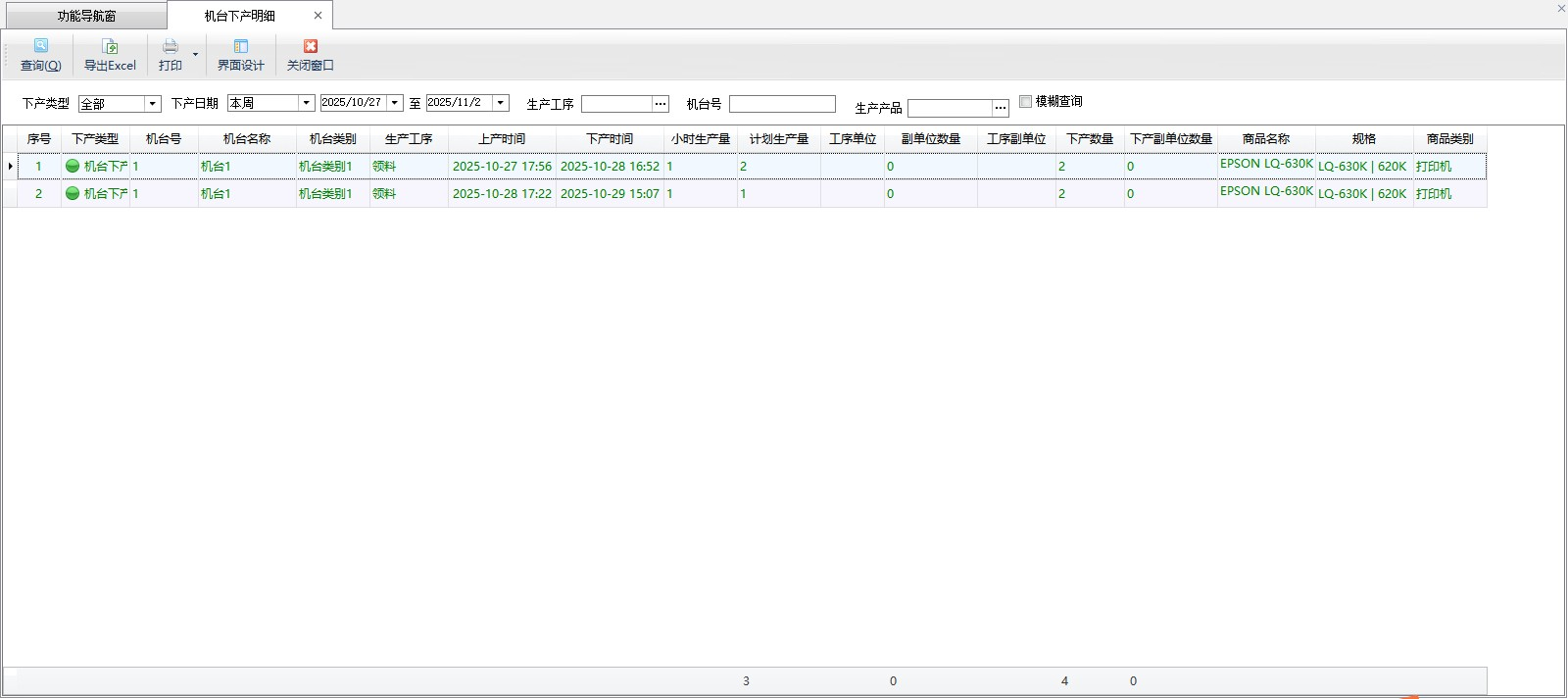 导出Excel:在工具栏点击“导入导出”—》“导出到Excel”,可以将机台下产明细导出为Excel文件。
