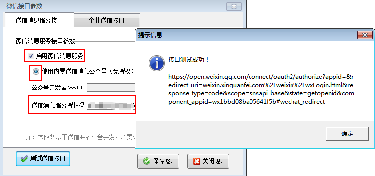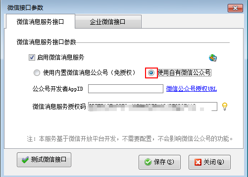 授权成功后,我们会分配微信云服务使用的期限和服务密码。把服务密码复制到微信接口参数中。点击测试接口,提示“接口测试成功”则可以开业务单据推送微信消息。如下图所示: