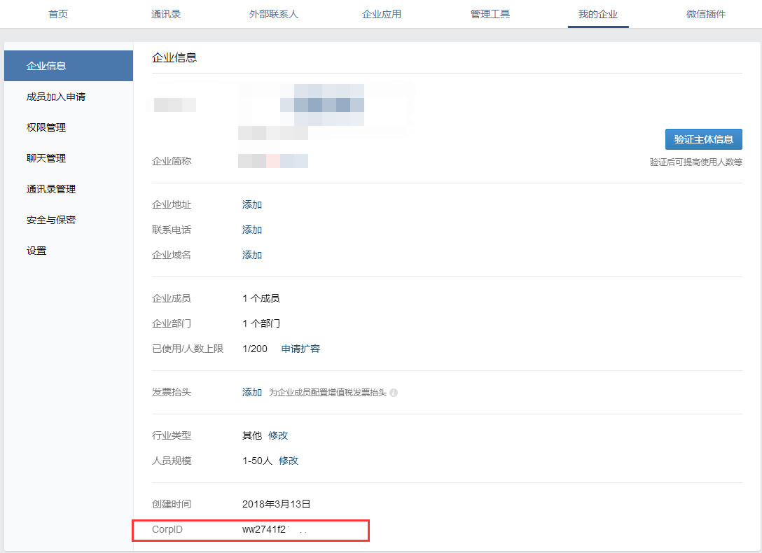 CorpId:登录企业微信,然后点击“我的企业”—》“企业信息”,在企业信息内可以查看“CorpId”,如下图所示。