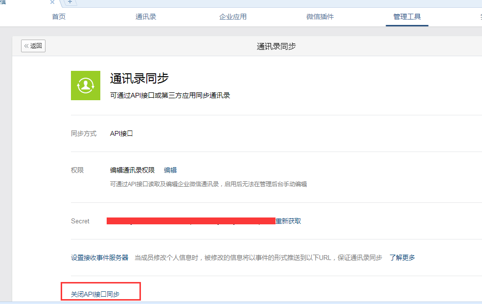 通讯录同步Secret:在企业微信内点击“管理工具”—》“通讯录同步”,在通讯录同步界面开启API接口同步,开启后可以查看通讯录同步Secret。