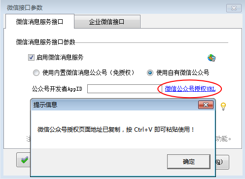 授权微信云服务:把公众号开发者 ID 信息复制到参数配置界面的公众号开发者 AppID 中,点击“复制微信公众号授权页面 URL”,提示“授权页面地址已复制,按 Ctrl+V 即可复制粘贴使用”。如下图所示: