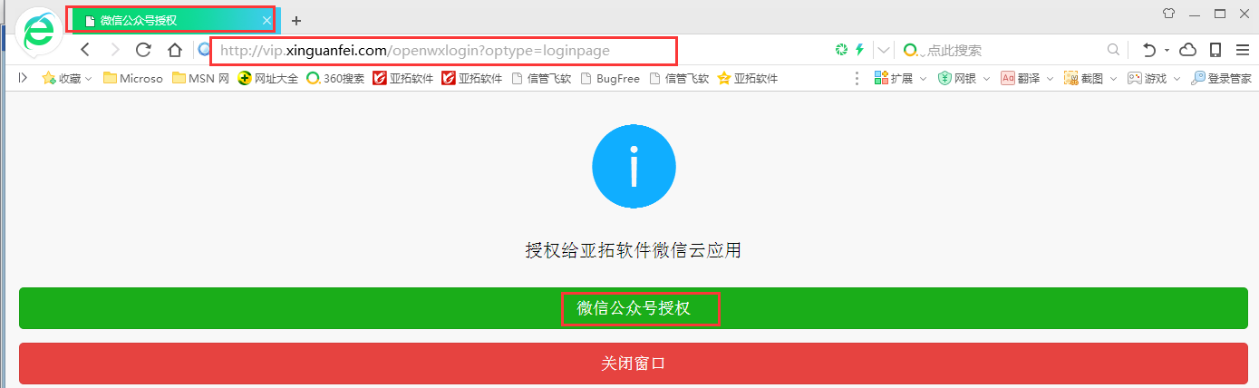 打开浏览器,在浏览器地址栏中按 Ctrl+V,把微信公众号授权页面地址复制进去,点击确认键进入授权页面,如下图所示:
