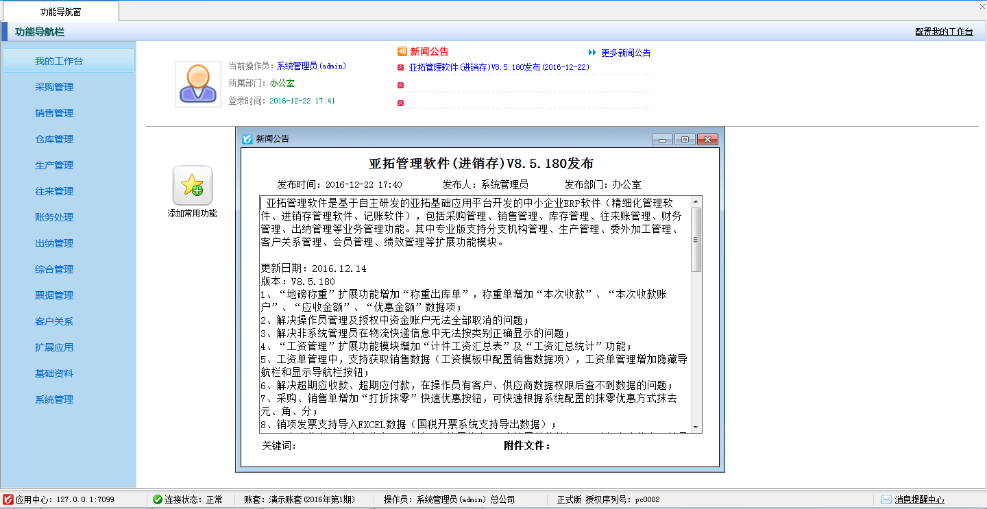 操作员登录软件后在“我的工作台”—》“新闻公告”即可查看已经发布过的新闻公告信息,如下图所示。