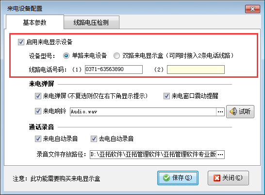 来电设备配置:使用来电弹屏功能首先需要外接设备来电显示盒,来电显示盒连接配置好之后需要在软件内启用来电显示设备并设置线路电话号码,来电显示配置如下图所示: