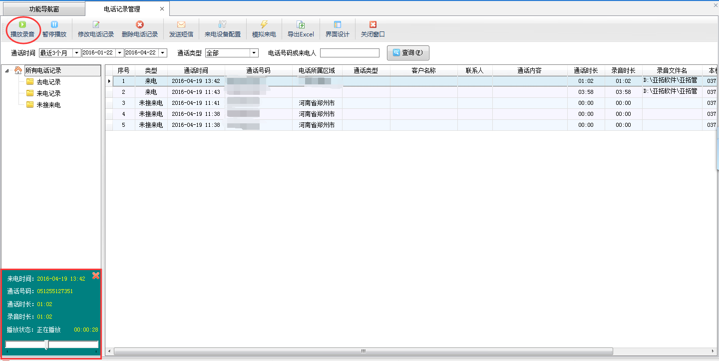 在电话记录管理界面选择通话时间,输入来电号码或者来电人信息查询即可查询到我们所需要的来电信息,选择所需要的来电信息,点击“播放录音”按钮即可播放当前来电的通话自动录音,点“暂停播放”即可暂停正在播放的录音文件。