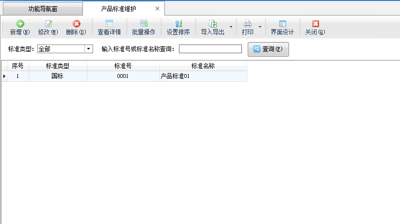 在功能导航窗点击“扩展应用”—》“产品标准维护”可以打开产品标准维护界面,可以维护产品标准。