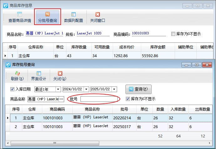 查看库存:选择单据明细中的商品记录,点“查看库存”按钮可以查看当前商品的库存情况,如果商品启用批号管理支持分批号查询库存。