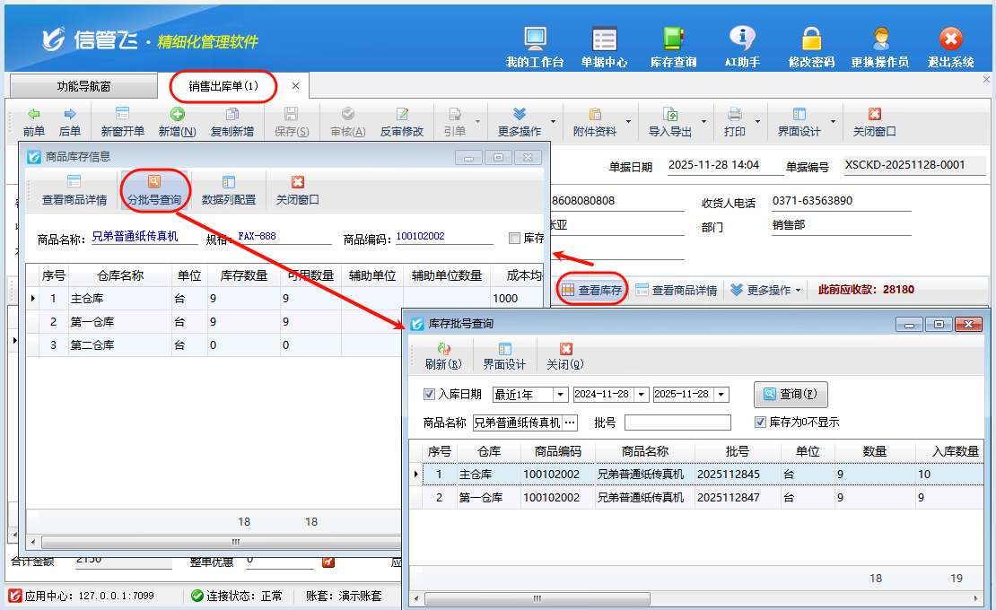 销售开单界面“查看库存”可查看商品在不同仓库的库存数量、可用数量、成本均价、库存金额等,批号商品可点击“分批号查询”,会弹出商品不同批号在不同仓库的库存数量,如下图所示: