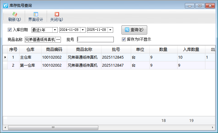 “库存批号查询”界面支持按入库日期、商品名称、批号等条件进行检索。方便批号比较多时快速检索出此批号商品。