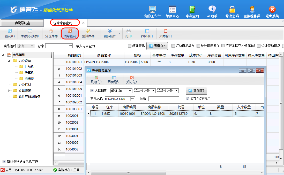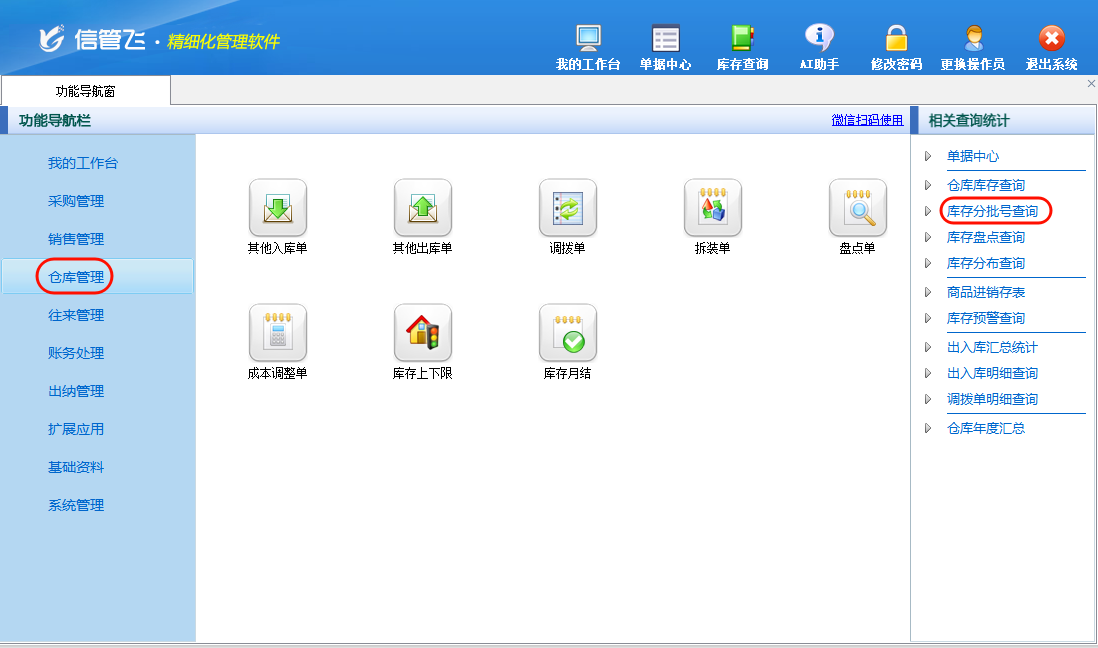 仓库管理相关查询统计中可查看商品的库存数量,批号商品库存数量可在“库存分批号查询”和“库存查询”中查看。