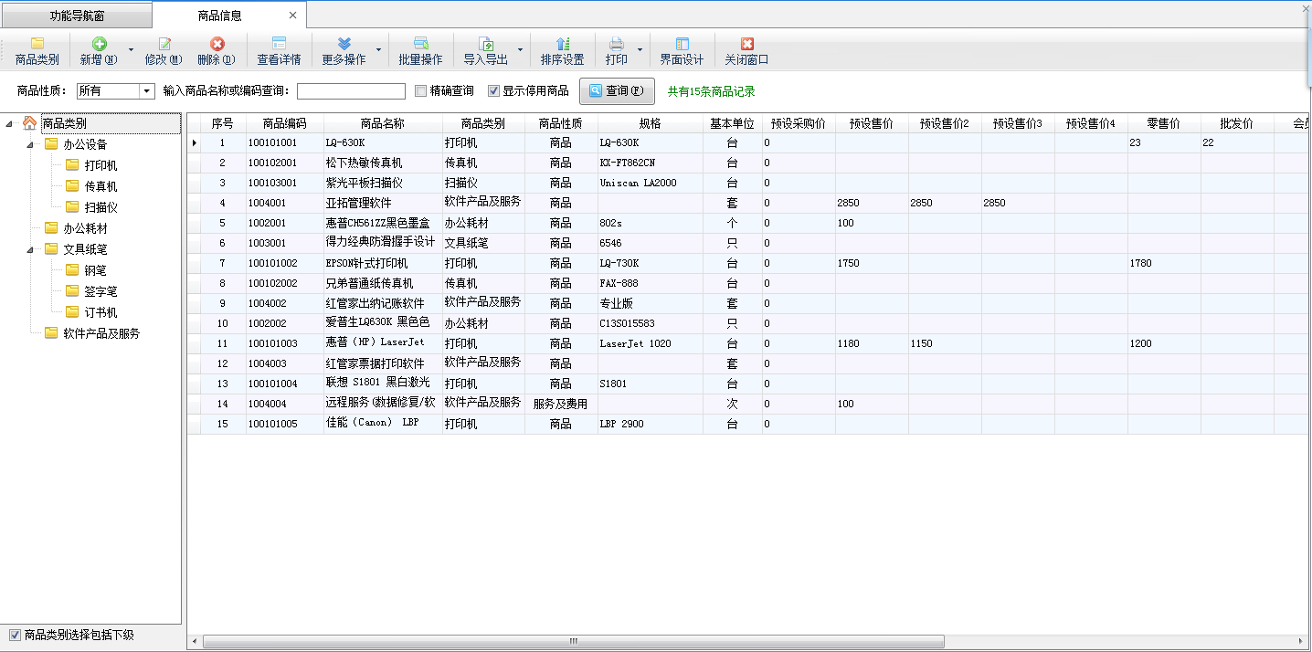 点“基础资料”—》“商品信息”可以进入商品信息管理功能。点“商品类别”按钮可以管理商品类别,点“新增”按钮可以增加新商品,点“修改”按钮可以修改商品信息,点“删除”按钮可以删除商品。软件只支持删除未使用过的商品(即在业务单据中没有使用过的),已使用过的商品,如果不再使用可以设置为“已停用”。