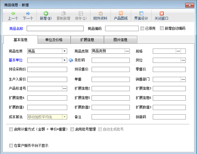 商品性质:分为商品、原材料、包材、服务及费用四种。“服务及费用”为虚拟商品,可以管理维修费、服务费、运费等各类杂费,“服务及费用”不计算库存数量,在仓库库存查询中不会显示。原材料和包材主要在“生产管理”功能中使用,可配置生产领料是否只允许原材料和包材出库。