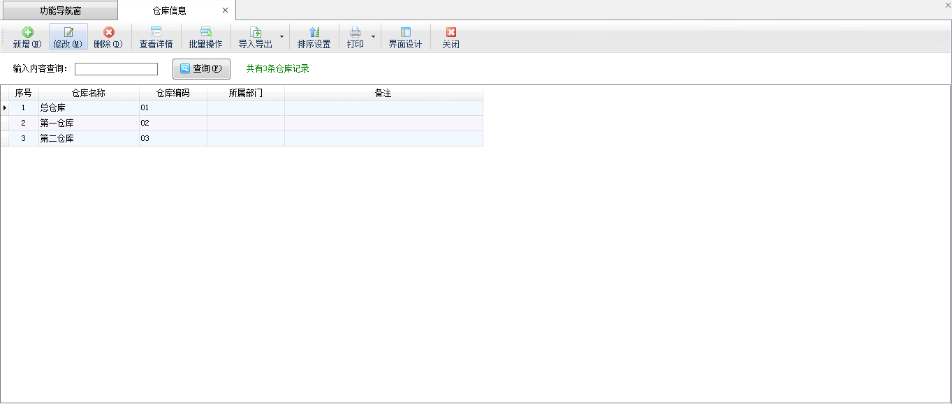 点“基础资料”—》“仓库信息”可以进入仓库信息管理功能。点“新增”按钮可以增加新仓库,点“修改”按钮可以修改仓库信息,点“删除”按钮可以删除仓库。点“排序设置”按钮可以对仓库进行排序,后续在选择仓库和仓库查询中可以按照排序进行显示。