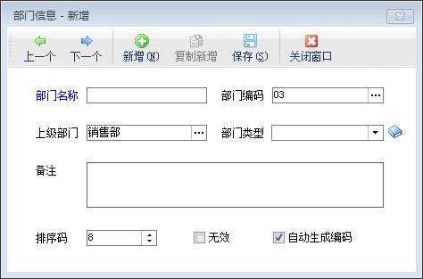 部门资料:部门名称、部门编码(可选);
