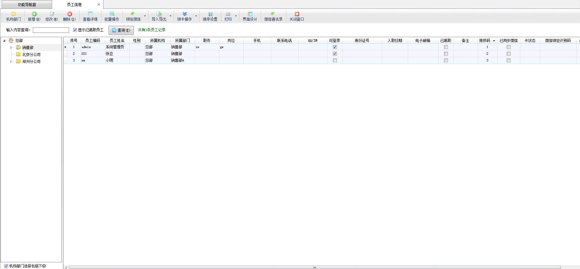 点“新增部门”可以增加新的部门,点“修改部门”可以修改部门信息,点“删除部门”可以删除部门。点“查看详情”可以查看部门信息,查看部门信息窗口默认是只能查看,无法修改的。