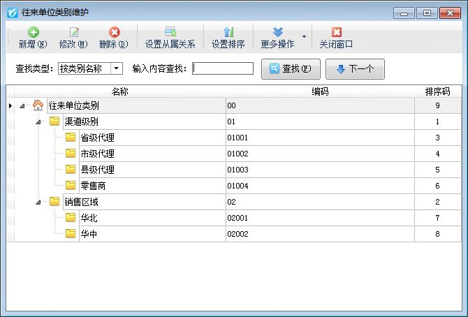 软件支持无限层级的往来单位类别,并支持自动生成类别编码,方便后续查询和统计。点“设置从属关系”进入拖动调整从属关系模式,可以拖动改变类别的从属关系。点“设置排序”可以调整类别的排序。