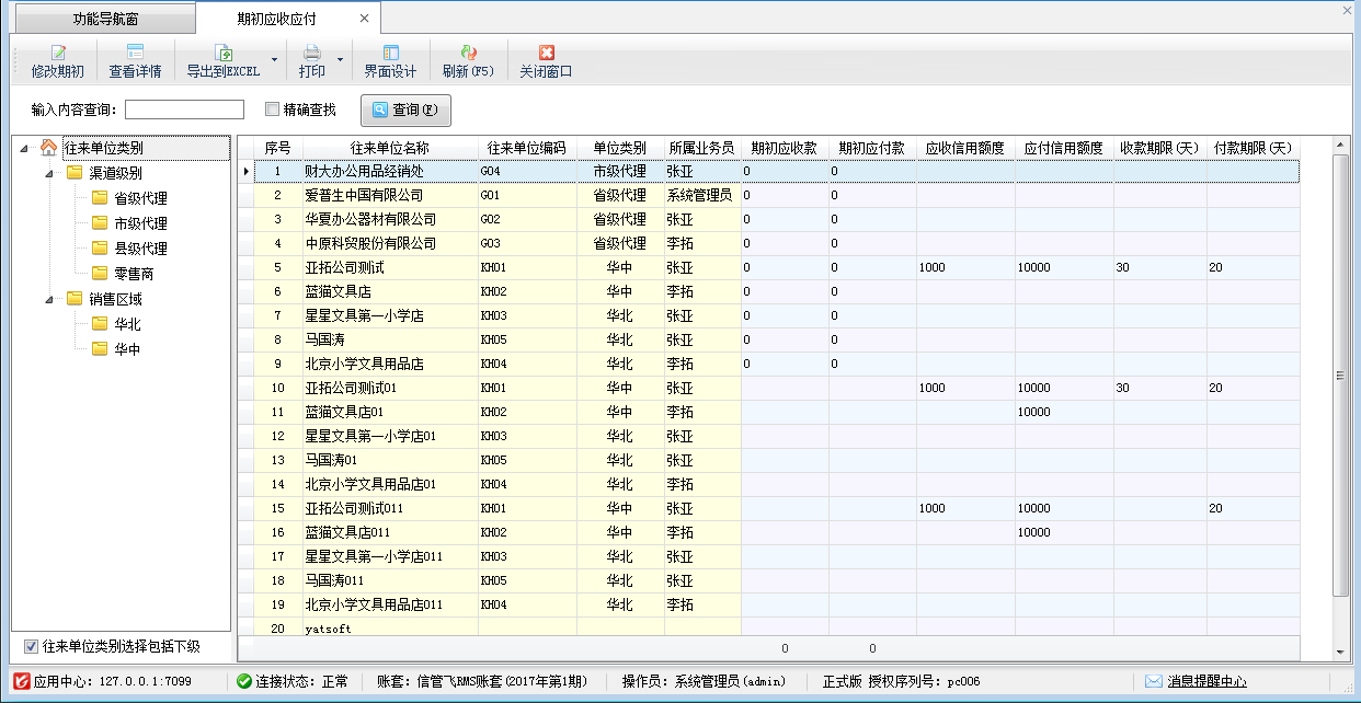 点“基础资料”—》“期初建账”,然后点“期初应收应付”功能按钮,进入“期初应收应付”可录入往来单位的期初应收款和应付款。期初应收应付款支持通过Excel批量导入。