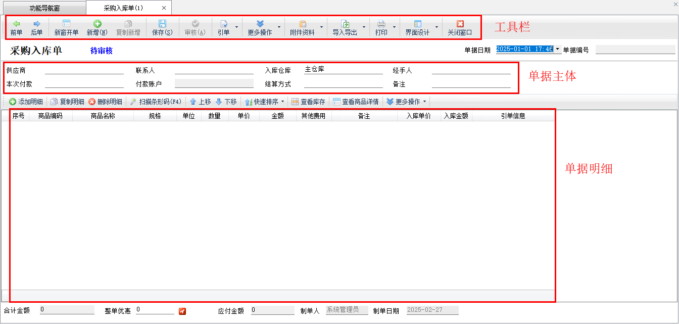 在功能导航中点“采购管理”—》“采购入库单”,进入采购入库单录入界面,单据界面分为“工具栏”、“单据主体”、“单据明细”三部分。