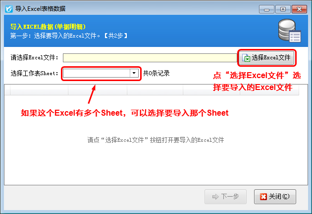 ①方式一:点“导入导出”—》“从Excel导入明细”,弹出“导入Excel数据”窗口,导入方式“直接选择Excel文件”,如下图所示: