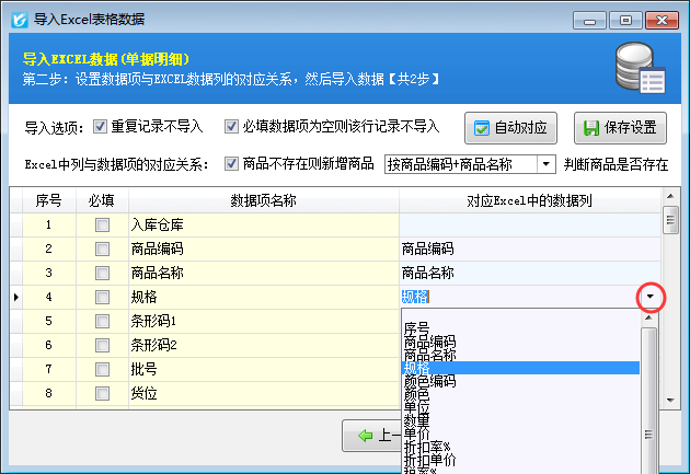 比如选择“按商品编码+商品名称”,商品资料库存中如果存在商品编码一样且商品名称一样的商品信息则不再新增加。