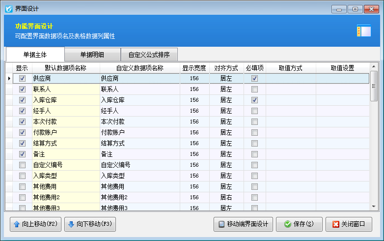 界面设计:点“界面设计”按钮可以对单据界面上的数据项进行自定义,实现企业的个性化需求。