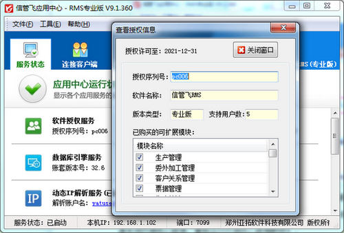 授权成功后,在应用中心内点菜单“帮助”->“查看授权信息”,在打开的查看授权信息界面即可查看软件授权相关信息(如授权许可时间、软件版本类型、支持用户数及已购买的扩展模块等),如下图所示。