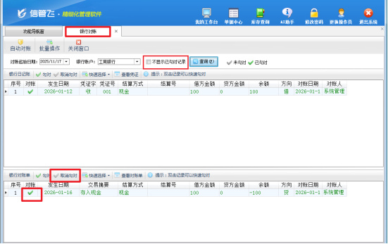 打开软件,在功能导航窗依次点击“出纳管理”—》“银行对账”,进入对账界面,找到要删除的对账单,点击“取消勾对”按钮解除勾对状态,随后就能顺利删除。