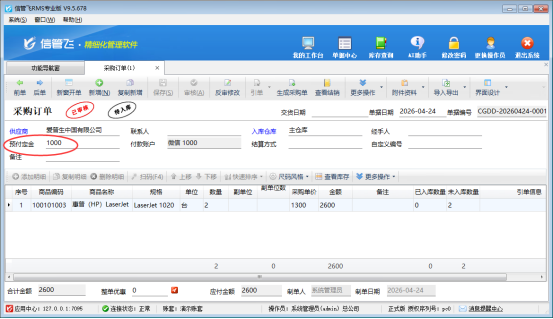 1. 采购订单录入:在功能导航窗找到“采购管理”→“采购订单”,新建订单后,直接在“预付定金”栏输入金额,保存并审核,系统会自动记录,后续结算可直接关联,无需单独登记。