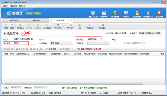 2.直接新增预付款:无采购订单时,在“付款结算单”界面,新增采购预付款,手动录入预付金额和供应商信息,即可完成登记。