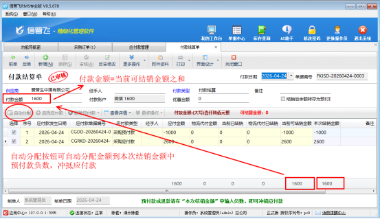 在应付款管理界面,点击工具栏的“付款结算”按钮,进入结算界面后,系统会自动显示供应商本次的预付定金(1000元)和应付款金额(2600元),无需手动核对。此时你只需输入实际要支付的金额——用应付款减去预付款,也就是1600元,再点击“自动分配”按钮,系统会自动将1000元预付款分配到本次结销金额中,精准抵扣。