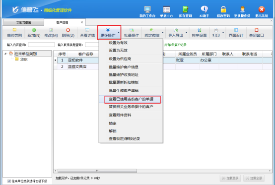 之所以会出现往来单位删除不成功的情况,关键在于这个往来单位已经在业务单据中被使用过了,可在客户/供应商信息界面上方工具栏“更多操作”下点击“查看已使用当前客户的单据”,此界面能清晰地看到所有使用过该客户/供应商的单据详情。