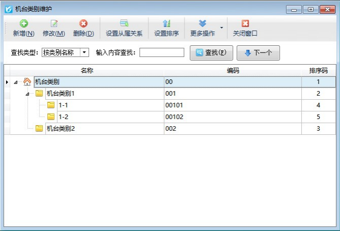 机台类别:点工具栏中的“机台类别”按钮,可对机台的分类进行维护。