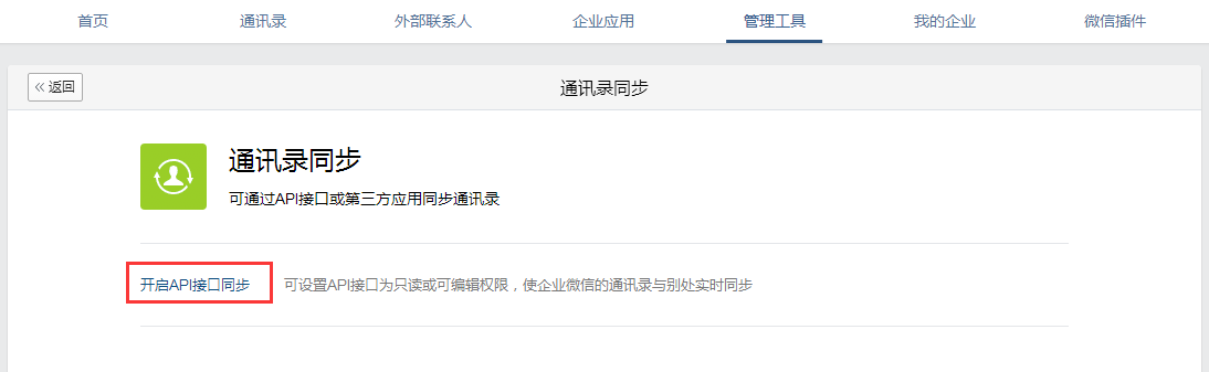 通讯录同步Secret:在企业微信内点击“管理工具”—》“通讯录同步”,在通讯录同步界面开启API接口同步,开启后可以查看通讯录同步Secret。
