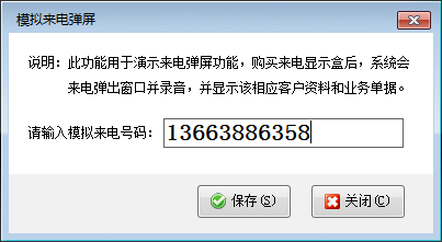 模拟来电:此功能可以实际模拟演示来电弹屏功能,在模拟来电弹屏窗口输入模拟来电号码,点击“保存”后系统会自动弹出来电弹屏窗口,如下图所示: