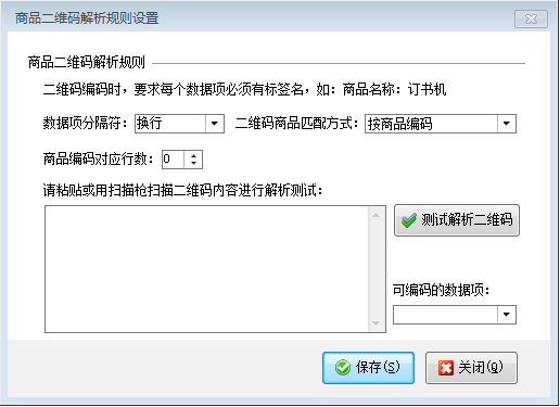 在功能导航窗点击“扩展应用”—》“商品二维码规则”可以设置商品二维码解析规则,其界面如下图所示。