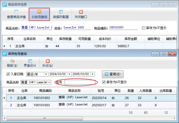 (6)查看库存:点击“查看库存”按钮,可查看当前商品不同仓库的库存信息;若商品存在不同批号可以分批号查询商品库存信息。