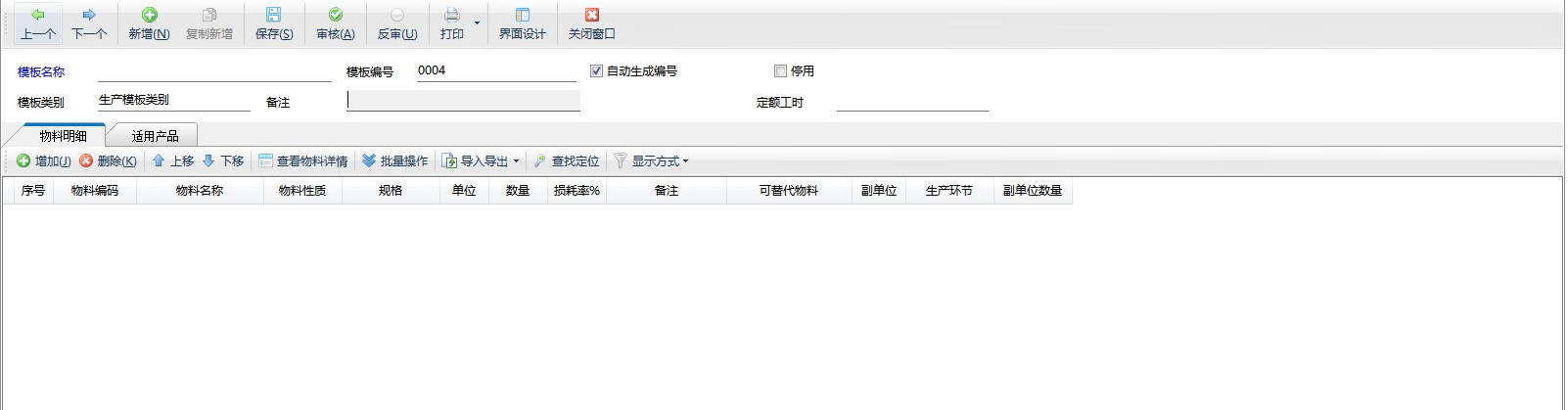 审核:点工具栏中的“审核”按钮,可以对“待审核”的生产模板进行审核,已审核的生产模板不允许随意修改,如需修改清先进行反审。