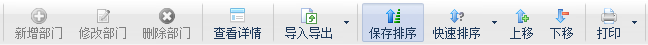 点“设置排序”按钮,可以进入排序模式,软件会显示几个排序按钮,可以点“快速排序”排序按照部门名称或编码进行自动排序,或者手工点“上移”、“下移”按钮设置排序。设置完成后,点“保存排序”即可保存排序设置。