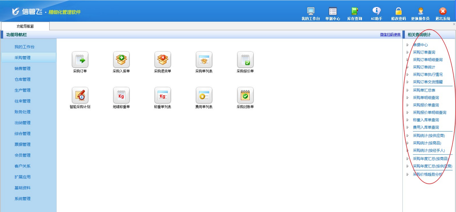 软件中包括各种业务查询和统计,在功能导航窗右侧“相关查询统计”中点击相应的统计查询项目,即可查询和统计相应的数据。