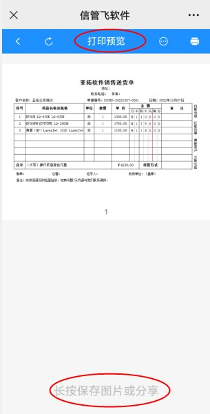 点击“打印预览”可显示默认模板的打印预览图,可长按保存图片或分享,如下图所示: