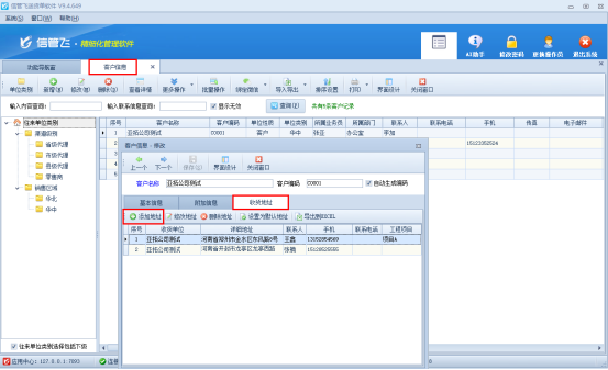 进入软件功能导航窗,选择 “基础资料” 中的 “客户信息”,找到目标客户后点击 “修改”。在客户信息修改窗口中,“基本信息” 栏的 “详细地址” 默认为核心收货地址,切换至 “收货地址” 标签页,点击 “添加地址” 即可弹出信息维护窗口。依次录入收货单位、联系人、联系电话、详细地址等关键信息后保存,新增地址会直接同步至地址列表,支持随时修改、删除或设为默认地址,一次维护即可长期复用,无需反复录入。