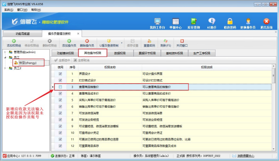 信管飞RMS软件通过操作员权限控制功能模块访问权限。若操作员账号未被分配“查看商品销售价”的操作权限,将导致金额字段不可编辑。