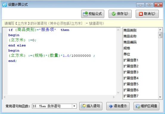 1、在单据明细标签页的默认列名中找到扩展数值1,自定义列名为立方米。并设置取值方式为“高级计算公式”,取值设置为: