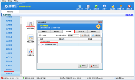 第一步,启用功能,快速配置。在功能导航窗点击“系统管理”—“系统参数配置”,在“业务参数”的特殊功能参数中,勾选“启用单据确认功能”,点击保存即可完成配置。